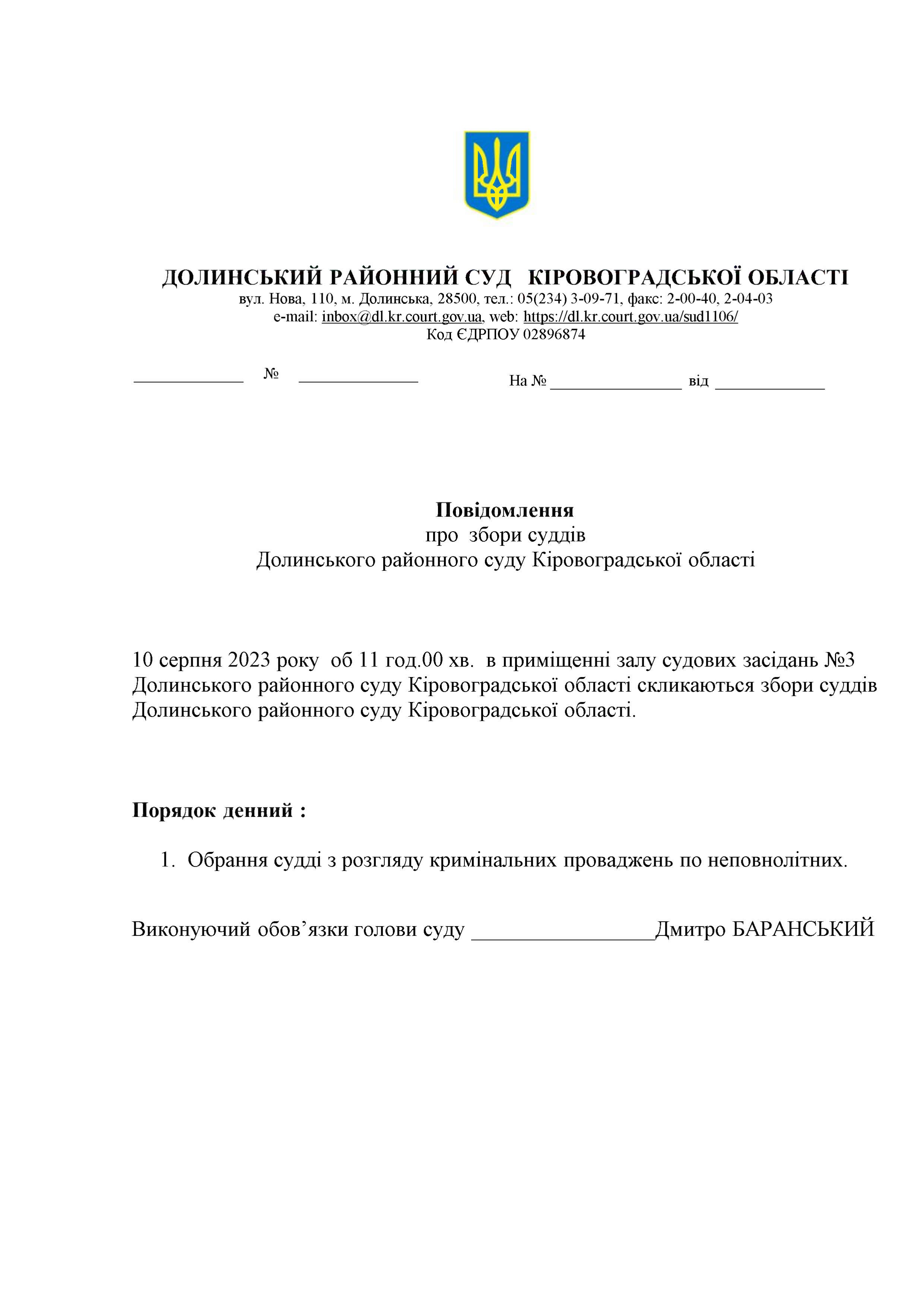 Повідомлення про збори суддів Долинського районного суду Кіровоградської області